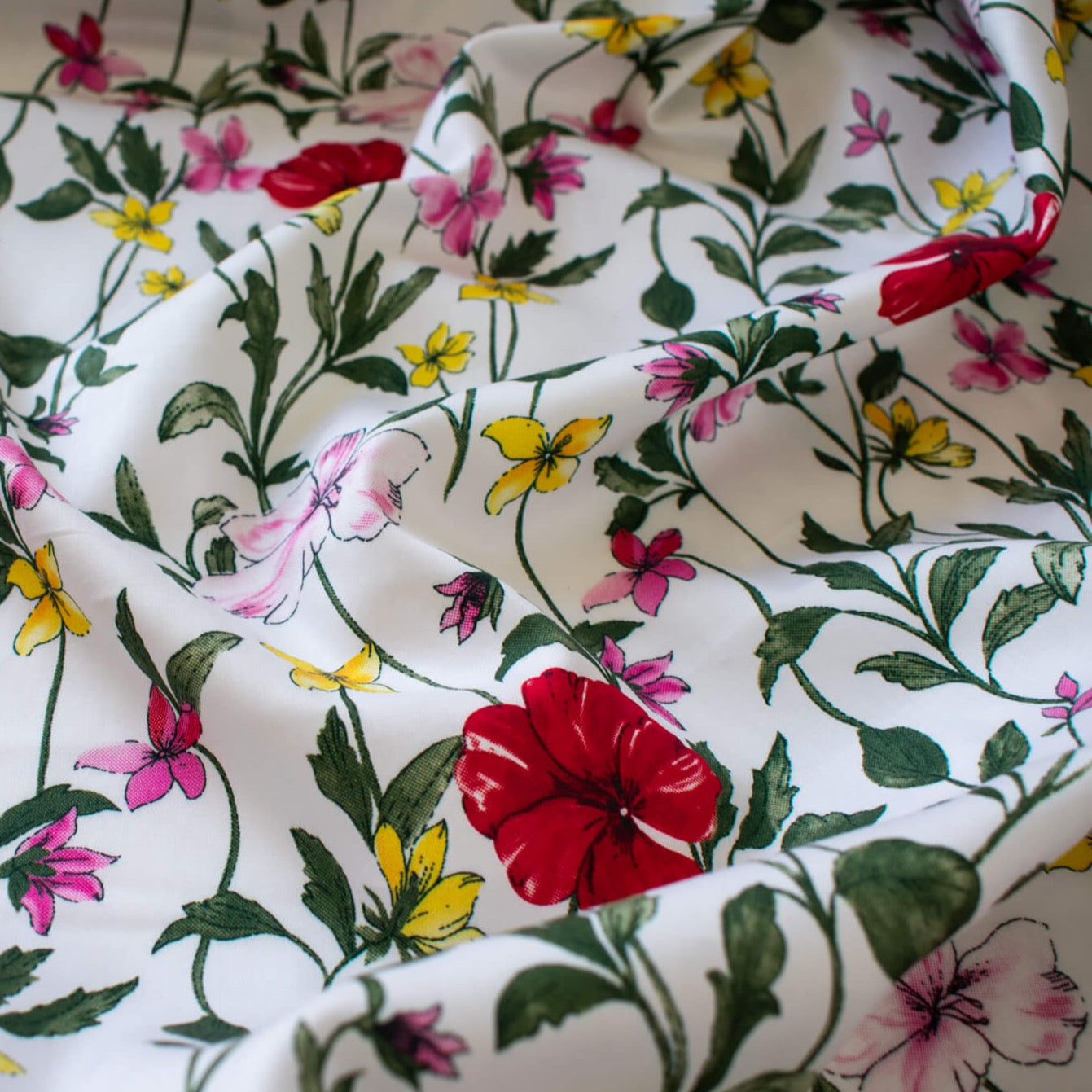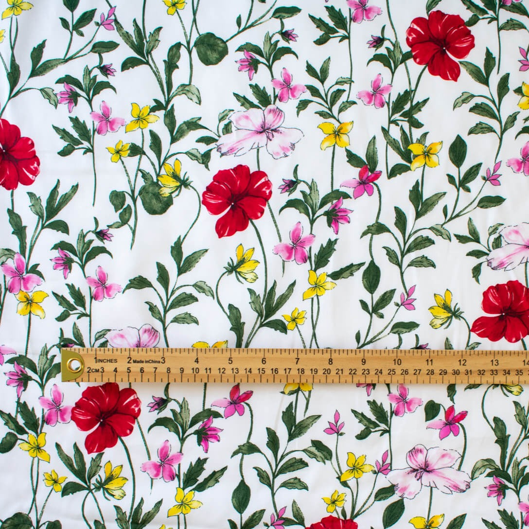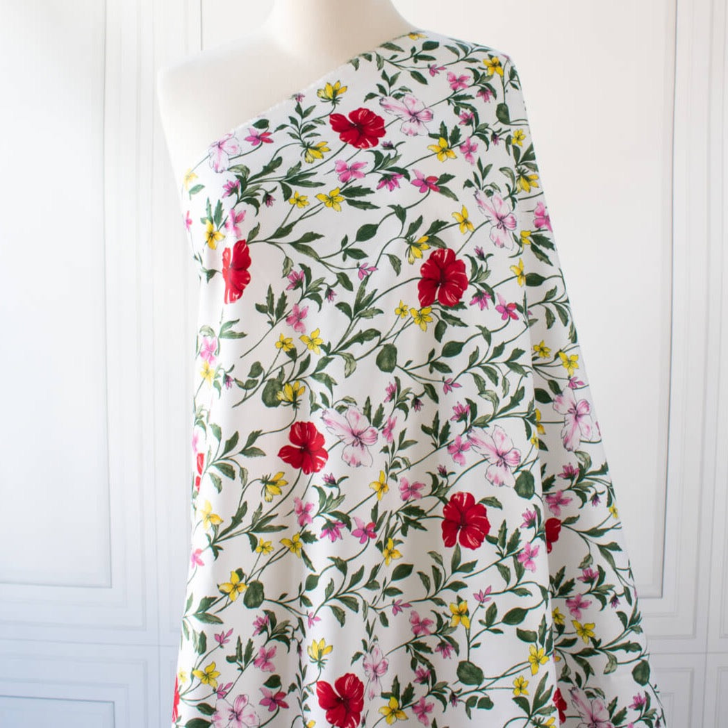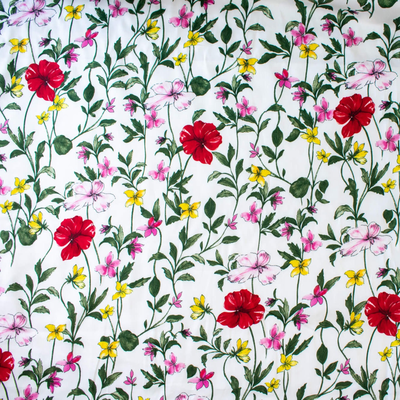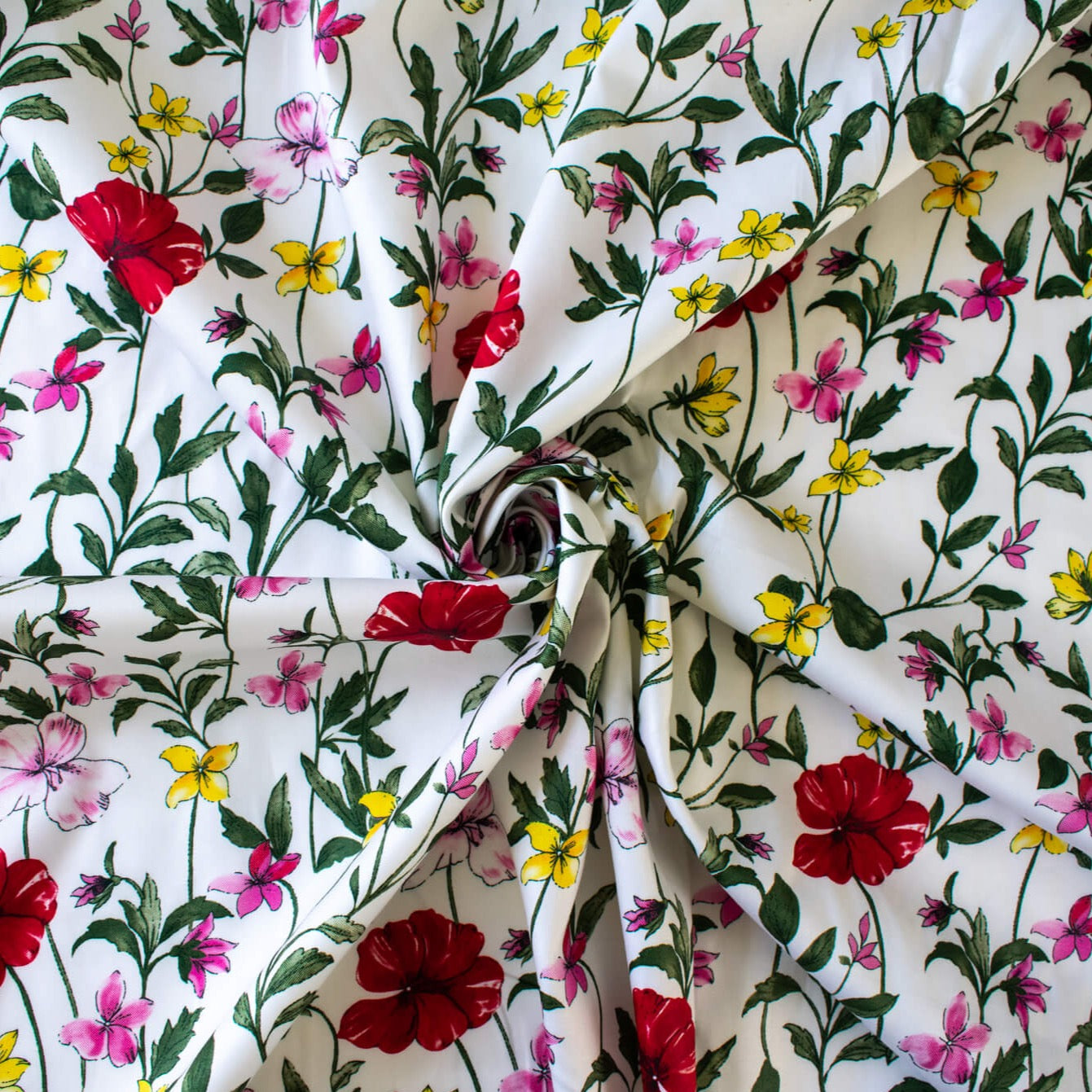 "Inspire" a flair for the dramatic with this Floral Cotton Sateen Shirting fabric by the yard! Unapologetically bold with its red, yellow, and pink flowers on a soft white background, it's sure to bring a sparkle to your wardrobe! Cotton sateen offers a luxurious sheen and smooth hand. This stunning shirting is a blossoming beauty!
